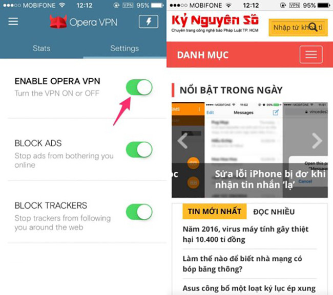 Đối với các thiết bị Android và iOS, bạn chỉ cần cài đặt ứng dụng Opera VPN tại địa chỉ https://www.operavpn.com/. Tương tự như trên, khi hoàn tất bạn chỉ cần nhấn Turn On để kích hoạt chế độ VPN (Virtual private network - mạng riêng ảo). Chế độ này sẽ giúp mã hóa kết nối và dữ liệu được truyền tải giữa thiết bị người dùng và máy chủ.