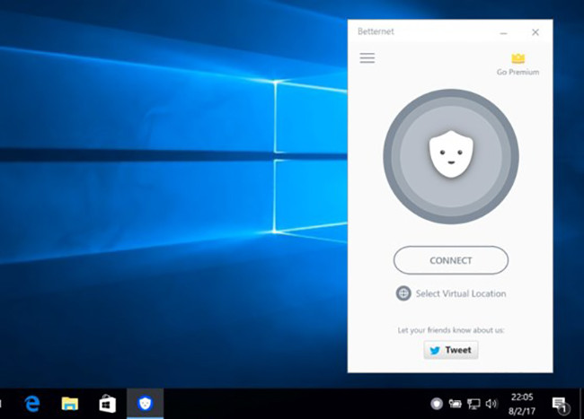 Ngoài ra, bạn cũng có thể cài đặt thử ứng dụng VPN miễn phí như Betternet tại địa chỉ https://www.betternet.co/ > Get Betternet. Khi hoàn tất, người dùng chỉ cần mở ứng dụng, bấm Connect để kết nối đến máy chủ. Nếu muốn thay đổi vị trí, bạn hãy nhấp vào tùy chọn Select Virtual Location ở ngay bên dưới và làm theo các bước hướng dẫn.