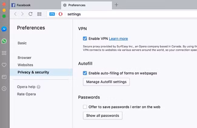 Đầu tiên, bạn hãy tải và cài đặt trình duyệt Opera cho máy tính tại địa chỉ http://www.opera.com/vi, ứng dụng tương thích với các thiết bị chạy Windows và macOS. Tiếp theo, bạn truy cập vào phần cài đặt ứng dụng, tìm đến mục Privacy & security > Enable VPN. Lúc này trên thanh địa chỉ sẽ xuất hiện thêm tùy chọn VPN, người dùng chỉ cần kích hoạt và lựa chọn máy chủ tương ứng.