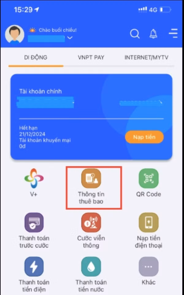 - Tại giao diện chính chọn mục “Thông tin thuê bao”