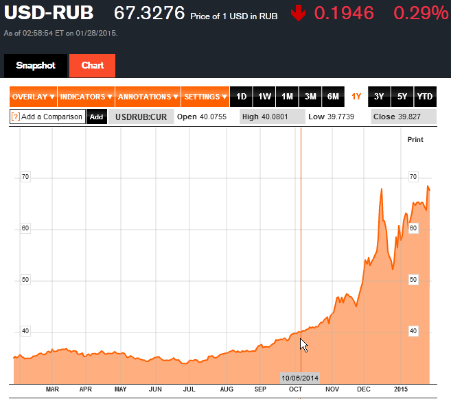 Ngày 26/1/2015, S&P đã hạ mức xếp hạng tín nhiệm của Nga xuống dưới mức khuyến nghị đầu tư, hay còn gọi là mức rác, qua đó khiến gia tăng chi phí tái cấp vốn cho các ngân hàng. Động thái trên của S&P đã khiến đồng Rúp giảm giá xuống 67 Rúp/USD.