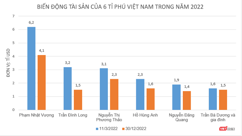 Nhưng đến ngày 30/12/2022, danh sách này chỉ còn lại 6 gương mặt, với tổng tài sản đạt 12,4 tỉ USD, 'bốc hơi' 5,9 tỉ USD so với đầu năm.