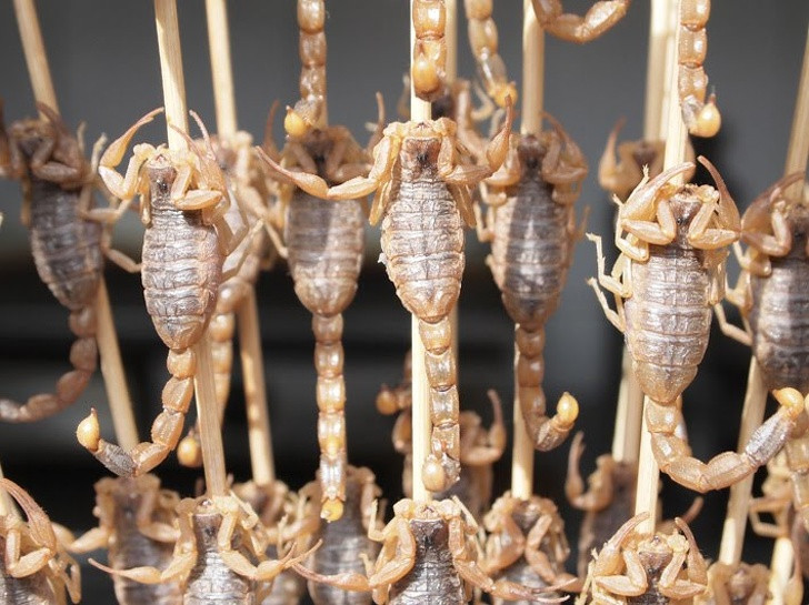 15. Thức ăn đường phố của Trung Quốc khá kỳ lạ nếu không muốn nói là kỳ dị. Bạn có muốn thử một con bọ cạp xiên que không?