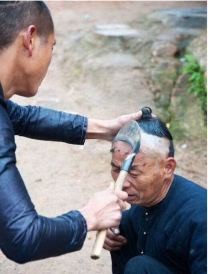 4. Bạn không nhìn nhầm đâu. Người Trung Quốc có thể cắt tóc bằng lưỡi liềm, dao quắm, và thậm chí là một máy mài góc. Và họ thậm chí chẳng cần một phòng đặc biệt để làm điều đó.