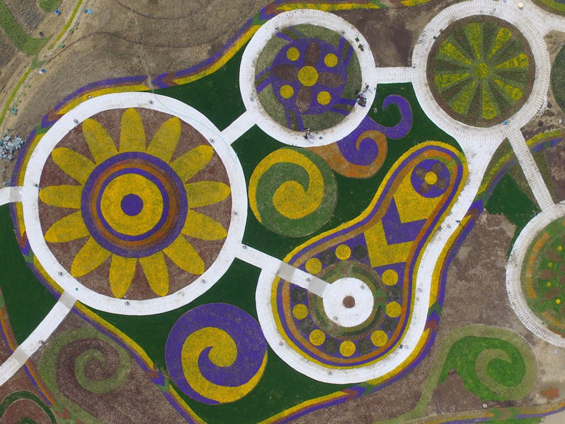 22. Mọi người xếp thành một tấm thảm dài 185m với nhiều màu khác nhau ở Thành Đô, tỉnh Tứ Xuyên. Bên cạnh là một bức điêu khắc chú gấu trúc khổng lồ.