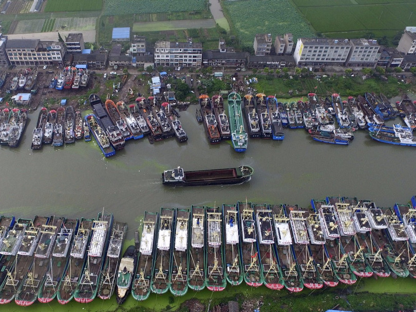 12. Neo thuyền tránh bão Chan-Hom tại Taizhou, tỉnh Chiết Giang. Chính quyền Trung Quốc đã đình chỉ các dịch vụ đào tạo, đóng cửa trường học, và đưa tàu đánh cá trở lại cảng.