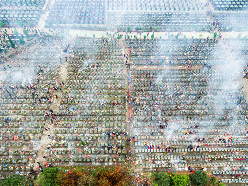 5. Khói đốt tiền giấy khi cầu nguyện tại một nghĩa trang trong lễ hội Thanh Minh ở Phúc Châu, tỉnh Giang Tây.