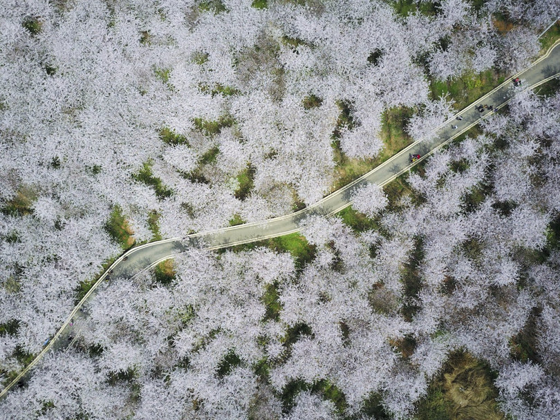 6. Hoa anh đào nở rộ dọc một con đường ở quận mới Gui'an, tỉnh Quý Châu.