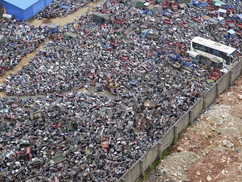19. Xe máy bị bỏ được xếp chồng chất tại một bãi phế liệu ở Tân Châu, tỉnh Hồ Nam.