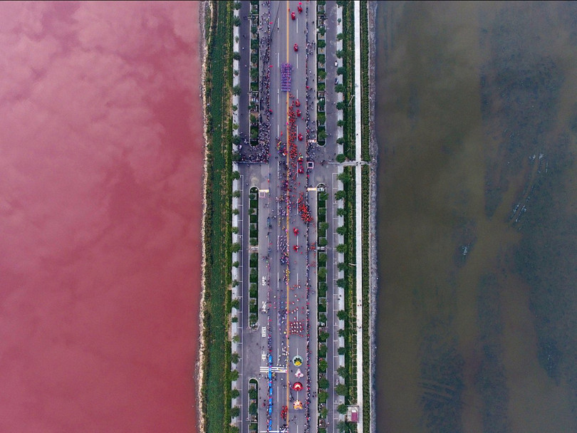 7. Giữa hai thế giới: một hồ muối một bên có màu đỏ của tảo được chia ra bởi một con đường ở Vận Thành, tỉnh Sơn Tây.
