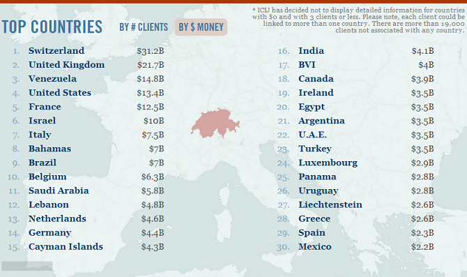 Trong danh sách này, các chủ tài khoản từ Thụy Sĩ đông nhất với 11.235 người, sở hữu 31.2 tỷ USD. Các tài khoản từ Anh, Venezuela, Mỹ và Pháp đứng tiếp theo trong các danh sách này.