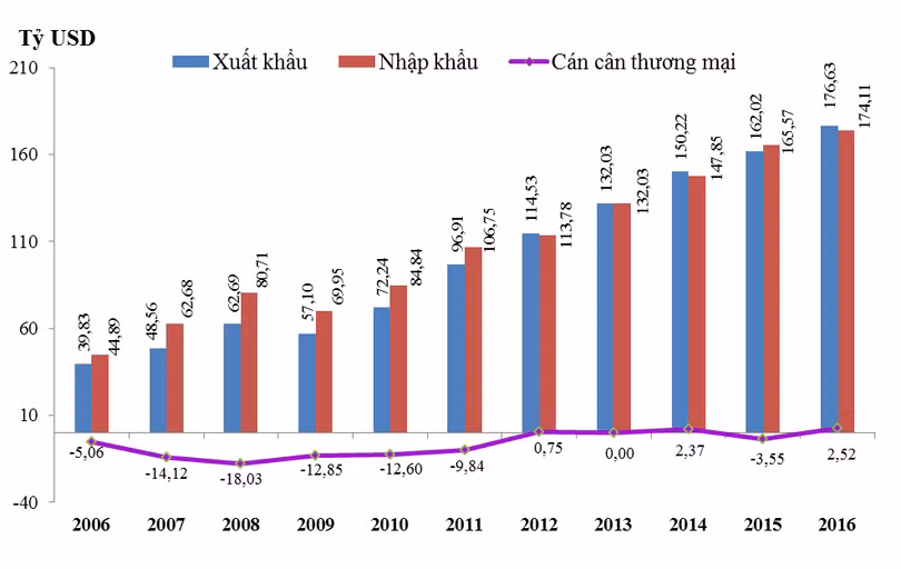 Tính đến hết 12 tháng/2016 tổng kim ngạch xuất nhập khẩu cả nước đạt hơn 350,74 tỷ USD, tăng 7,1%, tương ứng tăng gần 23,16 tỷ USD so với cùng kỳ năm trước. Trong đó, xuất khẩu đạt hơn 176,63 tỷ USD, tăng 9%, tương ứng tăng gần 14,62 tỷ USD; nhập khẩu đạt hơn 174,11 tỷ USD, tăng 5,2%, tương ứng tăng hơn 8,54 tỷ USD. Cán cân thương mại hàng hóa cả nước tháng 12/2016 thâm hụt 494 triệu USD, đưa mức thặng dư thương mại của cả năm 2016 còn hơn 2,52 tỷ USD.