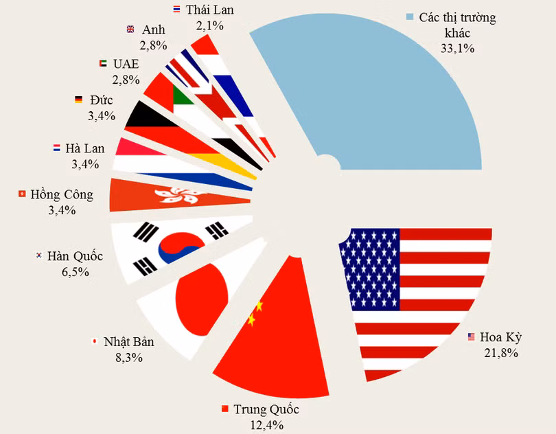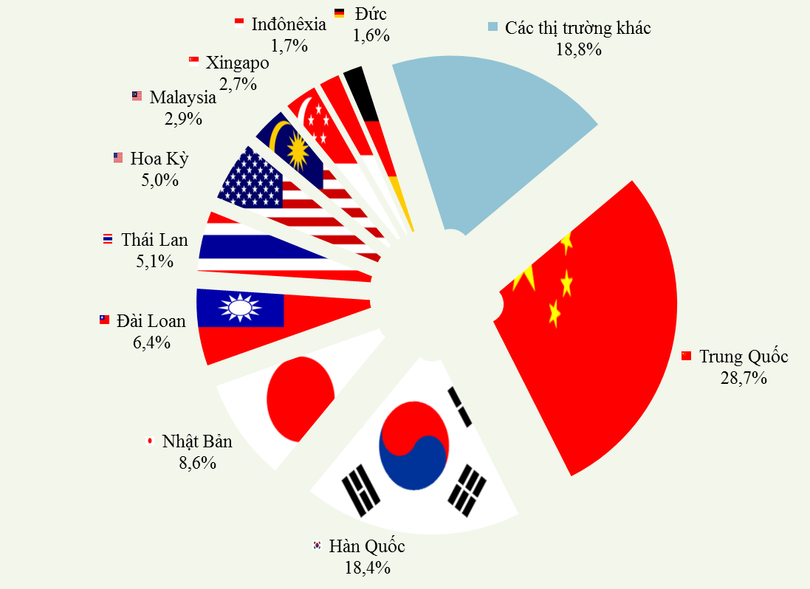 Trung Quốc là đối tác lớn nhất nhập khẩu nhóm hàng này của Việt Nam trong năm với 4,1 tỷ USD, tăng 47,2%; tiếp theo là EU đạt 3,73 tỷ USD, tăng 16,5%; sang Hoa Kỳ đạt 2,89 tỷ USD, tăng 2,05%; sang Hà Lan đạt 1,75 tỷ USD, tăng mạnh 53,5%...so với năm trước.