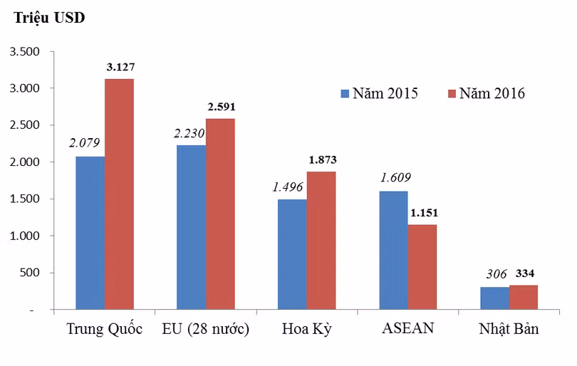 Các thị trường nhập khẩu hàng nông sản từ Việt Nam trong năm 2016 chủ yếu từ các thị trường sau: Thị trường Trung Quốc với gần 3,13 tỷ USD, tăng 50,4% so với cùng kỳ năm trước; thị trường EU (28 nước) với hơn 2,59 tỷ USD, tăng 16,2%; Hoa Kỳ đạt hơn 1,87 tỷ USD, tăng 25,2%; ....