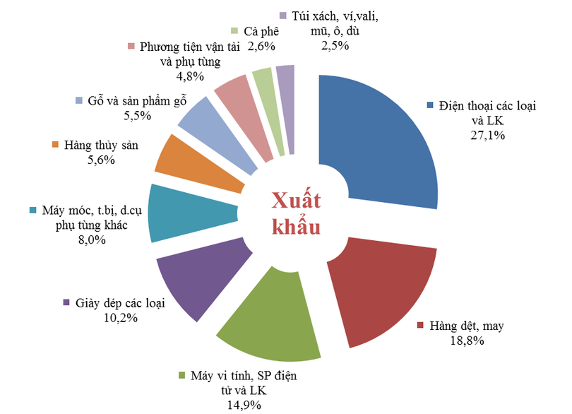 Kim ngạch xuất khẩu 10 nhóm hàng chủ yếu trong năm 2016 đạt gần 126,85 tỷ USD, chiếm 71,8% tổng kim ngạch xuất khẩu của cả nước. Trong đó, lớn nhất là nhóm hàng điện thoại các loại và linh kiện (gần 34,32 tỷ USD); tiếp theo là hàng dệt may (hơn 23,84 tỷ USD), máy vi tính, sản phẩm điện tử và linh kiện (gần 18,96 tỷ USD),...