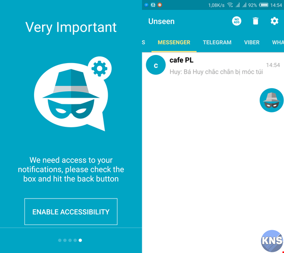 - Bước 1: Nếu đang sử dụng smartphone, bạn chỉ cần cài đặt ứng dụng Facebook Unseen tại địa chỉ https://goo.gl/wZUwsm, tương thích với các thiết bị Android 4.3 trở lên. Ứng dụng cho phép bạn có thể bí mật đọc tin nhắn trên Messenger, WhatsApp, Viber…