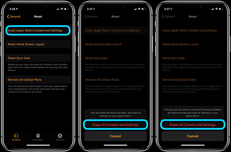 Trước khi reset Apple Watch, bạn cần chắc chắn mình đã sao lưu nó nếu bạn muốn khôi phục lại thông tin trong tương lai. Nếu bạn sao lưu iPhone bằng iCloud hoặc máy Mac, bản sao lưu của Apple Watch cũng sẽ được tạo tự động. Lưu ý, nếu bạn sao lưu bằng máy Mac, tất cả thông tin trong bản sao lưu Apple Watch đều sẽ được mã hóa.