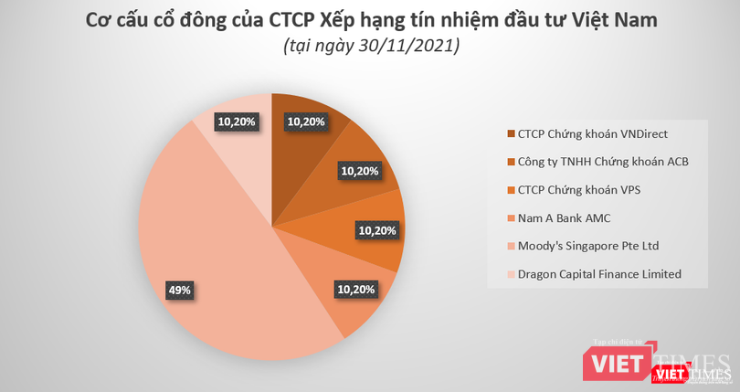 Dữ liệu của VietTimes cho thấy, VIS Rating được sáng lập bởi 6 thể nhân, dẫn đầu là Moody’s Singapore Pte Ltd với tỉ lệ sở hữu 49% vốn điều lệ. Tiếp đến là Dragon Capital Finance Limited, chiếm tỉ lệ sở hữu 10,2% vốn điều lệ. Số cổ phần còn lại của VIS Rating được chia đều cho các ‘tay chơi’ trong nước, bao gồm: CTCP Chứng khoán VNDirect (Mã CK: VND), Công ty TNHH Chứng khoán ACB (ACBS), Công ty TNHH MTV Quản lý nợ và khai thác tài sản – Ngân hàng TMCP Nam Á (Nam Á AMC) và CTCP Chứng khoán VPS (VPS).
