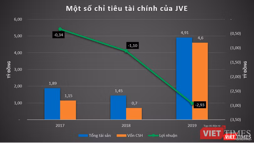 Từ khi thành lập, JVE chưa phát sinh doanh thu, cùng đó là khoản lỗ khoảng 1-3 tỷ đồng mỗi năm. Cụ thể, trong 3 năm 2017, 2018 và 2019, JVE lần lượt báo lỗ 340 triệu đồng, 1,1 tỷ đồng và 2,93 tỷ đồng.