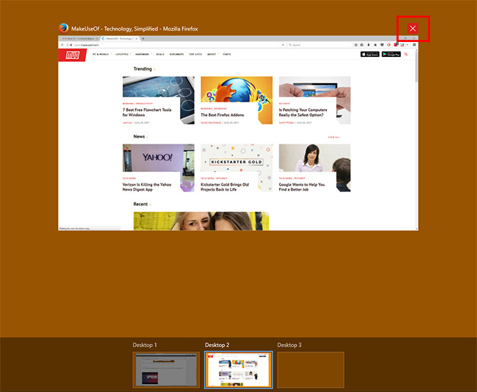 Bạn có thể dễ dàng đóng một cửa sổ trong một desktop nào đó bằng cách chuyển sang desktop có cửa sổ cần đóng, rê chuột vào cửa sổ muốn đóng, di chuyển lên nút X ở góc trên bên phải rồi nhấn vào nó.
