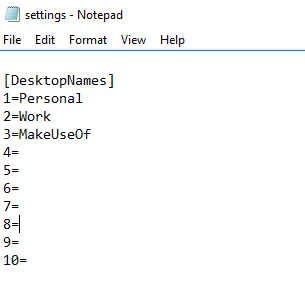 Để đặt tên cho desktop, mở file Settings.ini bằng Notepad, tìm phần DesktopNames. Bạn sẽ thấy có 10 desktop đánh số từ 1 đến 10, đặt tên cho desktop muốn dùng sau dấu "=".