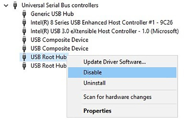 Các thiết bị ngoại vi đôi khi cũng chính là nguyên nhân khiến hệ thống hoạt động quá tải. Trong phần Device Manager, bạn hãy tìm đến mục Universal Serial Bus controllers và vô hiệu hóa mục Root Hub USB (tức là các thiết bị ngoại vi kết nối thông qua cổng USB).