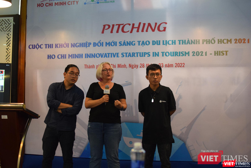 | Đại diện các thành viên sáng lập dự án của một đơn vị lữ hành ở TP.HCM tham gia cuộc thi, trả lời câu hỏi của Ban Giám khảo. Ảnh: Hòa Bình |