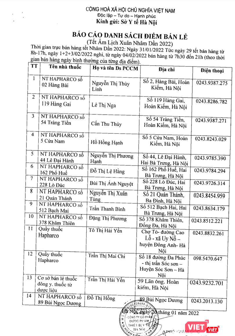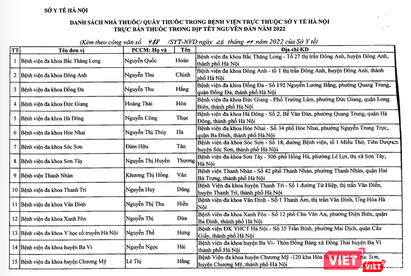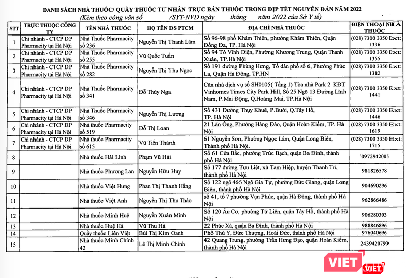 Sở Y tế Hà Nội chỉ đạo Trung tâm Kiểm soát bệnh tật Hà Nội đăng tải danh sách các cơ sở bán lẻ thuốc phục vụ Tết Nguyên đán Nhâm Dần 2022 trên địa bàn thành phố trên Website của Sở Y tế Hà Nội và các phương tiện thông tin đại chúng để người dân được biết.