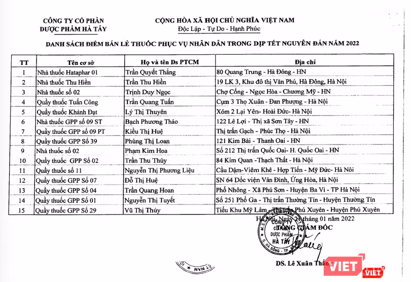 Theo đó, Phó Giám đốc Sở Y tế Hà Nội yêu cầu các cơ sở bán lẻ thuốc 24/24h trong những ngày nghỉ Tết Nguyên đán Nhâm Dần 2022, thực hiện nghiêm chỉ đạo của Cục Quản lý Dược và Sở Y tế Hà Nội.
