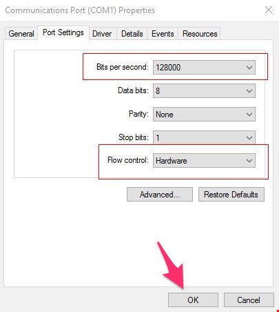 - Bước 2: Trong cửa sổ mới hiện, bạn hãy chuyển sang thẻ Port Settings, thiết lập tùy chọn Bits per second ở mức tối đa (tức 128000) và mục Flow control là Hardware rồi nhấn OK để lưu lại. Cuối cùng, bạn chỉ cần khởi động lại máy tính để áp dụng các thay đổi.