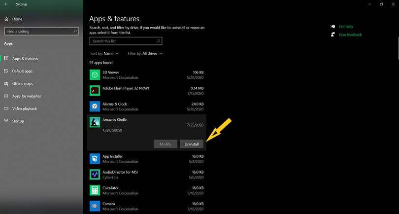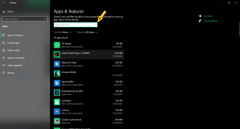 Bước 3: Tại cửa sổ mới mở ra, bạn sẽ thấy Windows liệt kê tất cả ứng dụng được cài đặt trên máy. Các bạn có thể tìm kiếm ứng dụng cần xóa bằng cách nhập tên nó vào ô Search this list. Hoặc bạn cũng có thể lọc ứng dụng theo tên từ A - Z hoặc theo kích thước/dung lượng của chương trình đó.