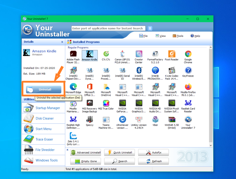Bước 1: Chạy phần mềm Your Uninstaller. Trên giao diện Your Uninstaller, tất cả các ứng dụng, chương trình bạn đã cài đặt sẽ được liệt kê. Nhấp chuột trái vào ứng dụng cần gỡ bỏ. Thông tin về ngày cài đặt và kích thước ứng dụng đó sẽ được hiển thị trong phần Details ở phía bên trái, các bạn chỉ cần chọn Uninstall.