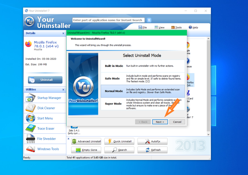 Bước 2: Xuất hiện giao diện gỡ bỏ phần mềm, bạn chọn chế độ gỡ bỏ mình muốn (Built-in Mode: chế độ tích hợp. Safe Mode: chế độ an toàn. Normal Mode: chế độ bình thường. Super Mode: chế độ nâng cao) sau đó nhấn Next để tiếp tục.