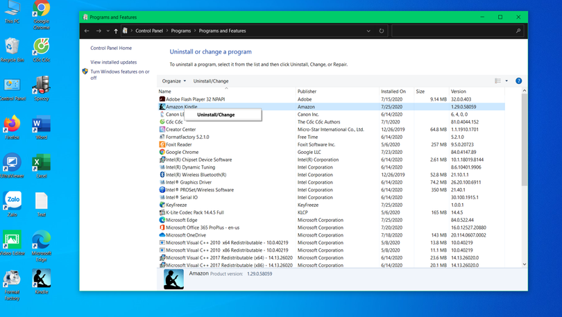 Nhấp vào biểu tượng Windows ở bên trái phía dưới cùng của thanh Taskbar. Chọn Control Panel > Programs and Features >Tìm chương trình bạn muốn gỡ bỏ cài đặt, nhấp vào ứng dụng đó > Nhấn Uninstall > Nhấn Yes để hoàn tất.