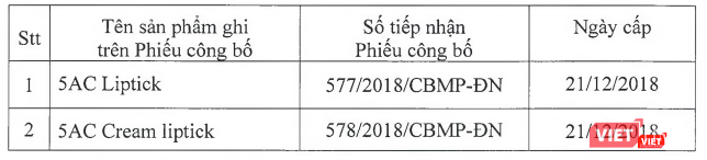 Theo Cục Quản lý Dược, 2 sản phẩm mỹ phẩm 5AC Liptick và 5AC Cream liptick do Công ty TNHH Thương Mại – Dịch vụ Dược Mỹ Phẩm M&M (địa chỉ: 12A/B6, Khu phố Bình Thuận 2, P. Thuận Giao, TX. Thuận An, T. Bình Dương) và Công ty TNHH Young Sung Vina (địa chỉ: Số 19 đường 03A, KCN Biên Hòa II, P. Long Bình Tân, TP. Biên Hòa, T. Đồng Nai) đứng tên công bố và chịu trách nhiệm đưa sản phẩm ra thị trường.