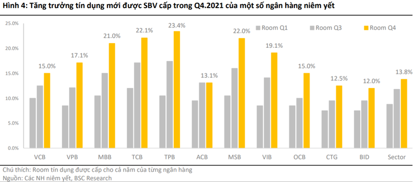 Có 4 ngân hàng được cấp mức tăng trưởng tín dụng trên 20% cho cả năm 2021, bao gồm: TPBank (23,4%), Techcombank (22,1%), MSB (22%) và MBBank (21%).