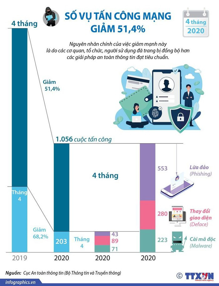 Riêng tháng 4/2020, đã có 203 cuộc tấn công vào các hệ thống thông tin tại Việt Nam dẫn đến sự cố, trong đó có 43 cuộc tấn công lừa đảo; 89 cuộc tấn công thay đổi giao diện và 71 cuộc tấn công cài mã độc.