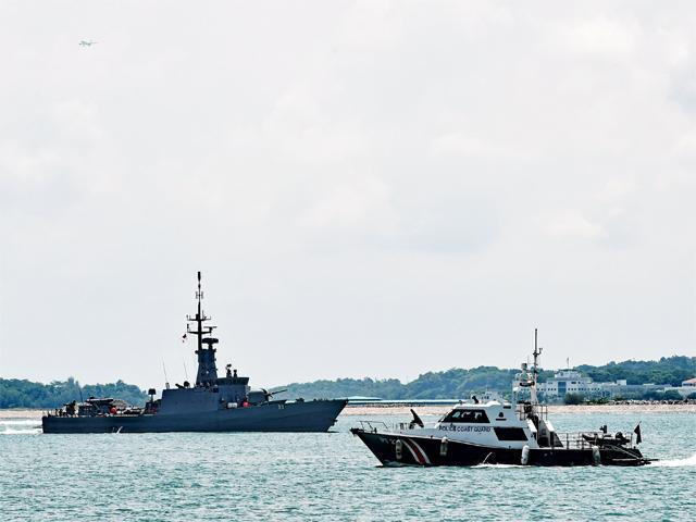 Một tàu tuần tra của hải quân Singapore (trái) và một tàu tuần duyên của cảnh sát di chuyển gần nơi tổ chức IMDEX Asia 2015. Ảnh: AFP