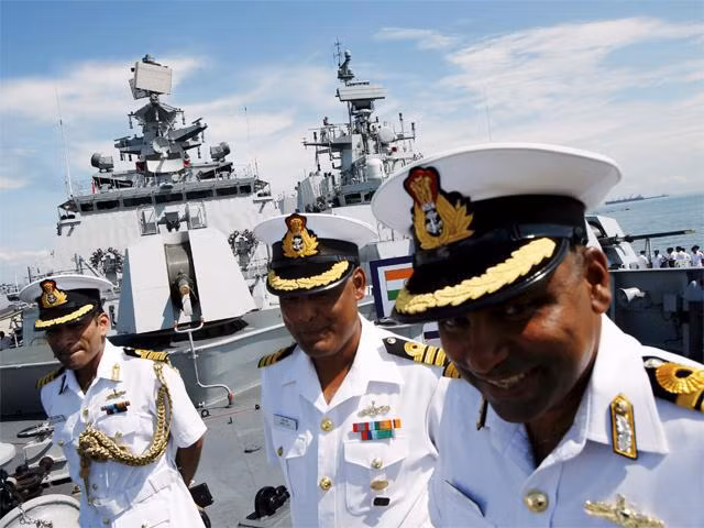 Hải quân Ấn Độ nói với báo chí trên tàu INS Satpura trong màn triển lãm các tàu chiến. Ảnh: Reuters