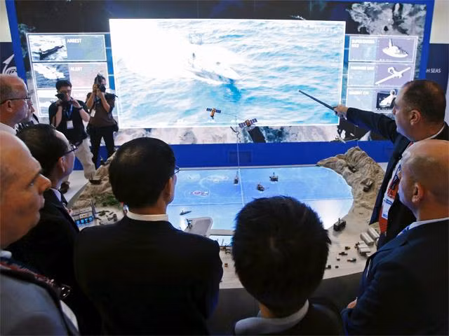 Khách tham quan xem màn trình diễn tại gian của Israel Aerospace Industries (IAI). Ảnh: Reuters