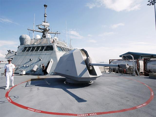 Một sĩ quan hải quân Mỹ đi qua khẩu pháo 57 mm trên tàu chiến Fort Worth. Con tàu này trước đó lần đầu tiên thực hiện cuộc tuần tra ở vùng biển quốc tế gần quần đảo Trường Sa. Ảnh: Reuters