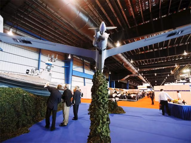 Hệ thống máy bay không người lái ScanEagle trưng bày tại triển lãm. Ảnh: Reuters