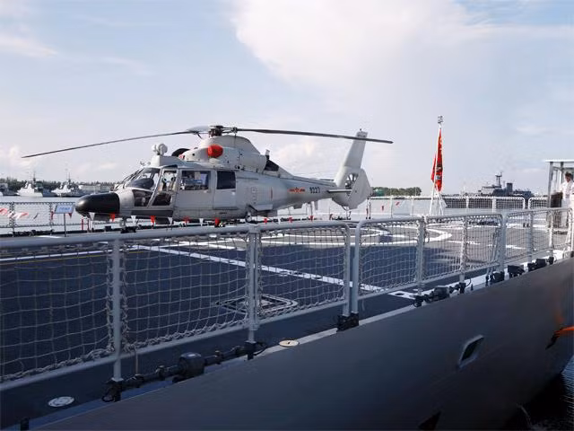 Trực thăng Harbin Z-9 của hải quân Trung Quốc trên tàu chiến CNS Yulin, trong một cuộc trưng bày tại căn cứ hải quân Changi, Singapore trước khi triển lãm diễn ra. Ảnh: Reuters