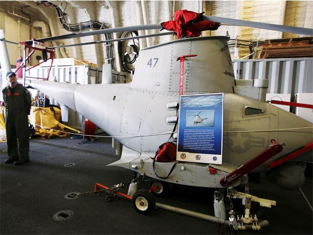 Nhân viên hải quân đứng cạnh máy bay không người người lái MQ-8B Fire Scout trên tàu Fort Worth. Ảnh: Reuters