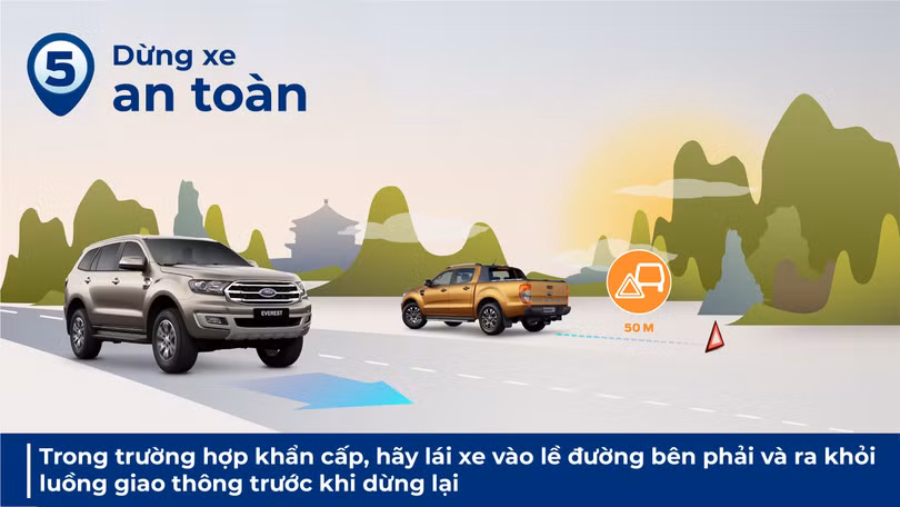Tuy nhiên, trong trường hợp khẩn cấp chẳng hạn như gặp vấn đề với xe cộ, hãy cố gắng lái xe vào lề đường bên phải và ra khỏi luồng giao thông trước khi dừng lại. Bật đèn dừng khẩn cấp và đặt biển cảnh báo nguy hiểm khoảng 50 mét phía sau xe của bạn để cảnh báo cho những xe phía sau.
