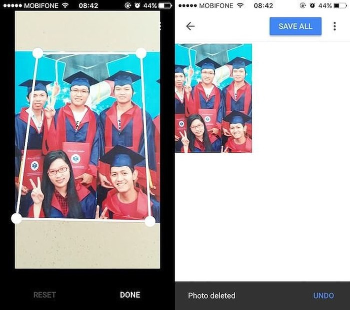 Khi hoàn tất, bạn có thể xoay/lật hình ảnh theo hướng bất kỳ (Rotate), chỉnh sửa lại vùng chọn (Adjust corners) hoặc xóa ảnh (Delete). Cuối cùng, nhấn Save All để lưu ảnh vào thư viện. Nếu muốn thêm hiệu ứng hoặc chỉnh sửa kỹ hơn, bạn có thể nhấp vào tùy chọn Open Google Photos. Với PhotoScan, bạn có thể biến những tấm ảnh cũ thời học sinh, ảnh chụp gia đình, bạn bè… thành ảnh số và lưu trữ trên smartphone chỉ với vài thao tác đơn giản.