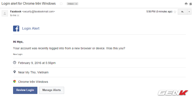 Với tính năng này, bạn sẽ nhận được một thông báo mỗi khi một ai đó (hoặc bạn vào các thời điểm) đăng nhập vào tài khoản Facebook từ một máy tính hoặc thiết bị không rõ. Thông báo này sẽ hiển thị rõ thông tin về thời gian, địa điểm và thiết bị mà tài khoản Facebook của bạn vừa đăng nhập.