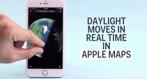 Khi thu nhỏ bản đồ Apple Maps về dưới kích thước của một quả cầu trên màn hình, vùng sáng, tối của Trái Đất sẽ hiển thị theo thời gian thực.