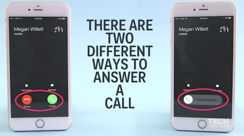 Tùy thuộc vào chiếc iPhone đang ở chế độ khóa màn hình hay mở khóa mà thông báo cuộc gọi tới sẽ khác nhau. Cụ thể, ở chế độ khóa màn hình, người dùng phải vút thanh trượt từ trái sang phải để nhận cuộc gọi - điều này giúp tránh trường hợp cuộc gọi vô tình được bắt máy khi để trong túi. Ngược lại, ở chế độ mở khóa, người dùng chỉ việc nhấn vào nút Answer.