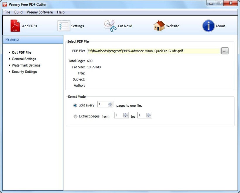 Weeny Free PDF Cutter là phần mềm hoàn toàn miễn phí cho phép chia, cắt một tập tin PDF bất kỳ thành những tập tin có kích thước nhỏ hơn với chất lượng hoàn hảo và tốc độ nhanh chóng mà không mất dữ liệu hay lỗi file, có thể cắt theo trang, bookmark hoặc cắt hàng loạt. Weeny Free PDF Cutter không cần các phần mềm đọc PDF hỗ trợ và không phụ thuộc vào driver máy in. Giao diện của phần mềm dễ sử dụng, chỉ cần một vài click chuột là hoàn thành quá trình cắt PDF.